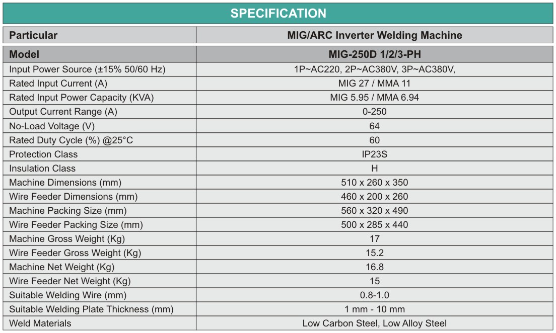 MIG/ARC INVERTER WELDING MACHINE 250D-1/2/3-PH